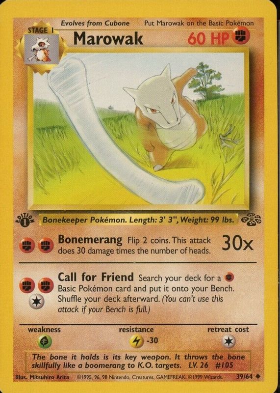 Marowak's Pokemon cards are available in at least 25 sets. Marowak's biggest 7-day price movers are 1999 Jungle #39/64 Unlimited, 2005 EX: Delta Species #010/113 Reverse Holo, and 2004 EX: FireRed & LeafGreen #007/112 Reverse Holo.