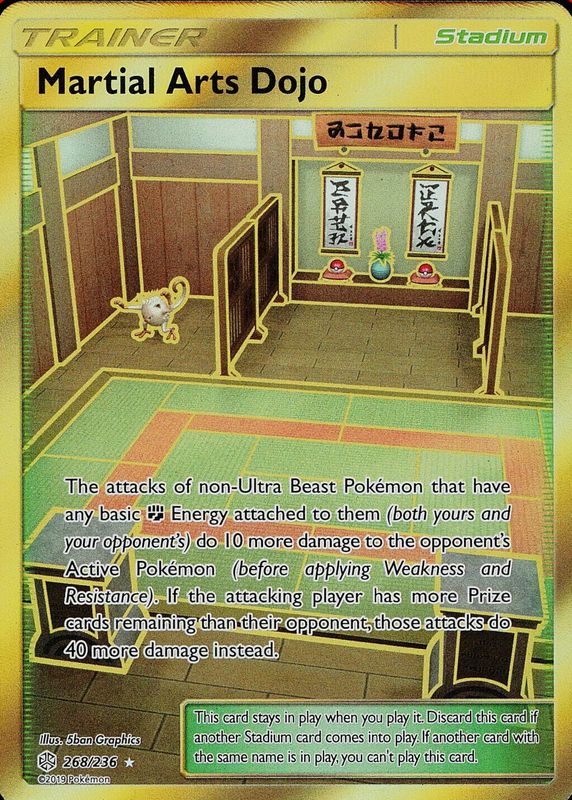 Martial Arts Dojo's Pokemon cards are available in at least 2 sets. Martial Arts Dojo's biggest 7-day price movers are 2019 Sun & Moon: Cosmic Eclipse #268/236 Holo (Secret), and 2019 Japanese Sun & Moon: Remix Bout #079/064 Ultra Rare.