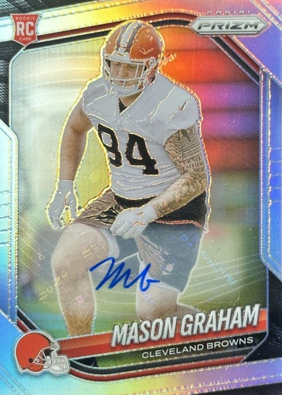 Mason Graham's Football cards are available in at least 25 sets. Mason Graham's biggest 7-day price movers are 2025 Prizm #354 White Disco, 2025 Prizm #354 Rookie Autographs - Green Scope /75, and 2025 Prizm #354 Pandora /400.
