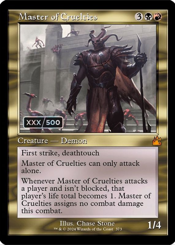The biggest 30-day change Master of Cruelties cards are 2024 Ravnica Remastered #0373 Retro Frame /500, and 2024 Ravnica Remastered #373 Retro Frame /500.
