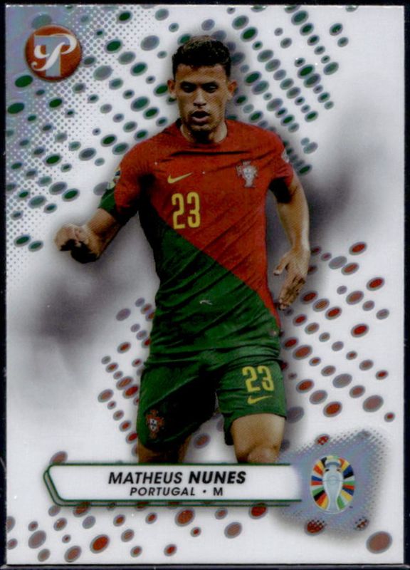 Matheus Nunes' Soccer cards are available in at least 41 sets. Matheus Nunes' biggest 7-day price movers are 2024 Topps Pristine Road to UEFA Euro #140 Refractor, 2023 Topps Finest Road to UEFA Euro #BCA-MN Card Autographs, and 2023 Topps Finest Road to UEFA Euro #BCA-MN Card Autographs - Orange Refractor /25.