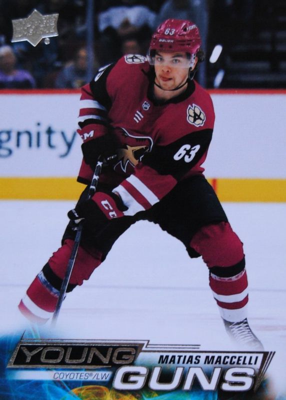 Matias Maccelli's Hockey cards are available in at least 37 sets. Matias Maccelli's biggest 7-day price movers are 2022 Upper Deck #216 Young Guns Base, 2024 O-Pee-Chee Platinum #R65 Retro Auto Red, and 2024 O-Pee-Chee Platinum #135 Seismic Gold /50.