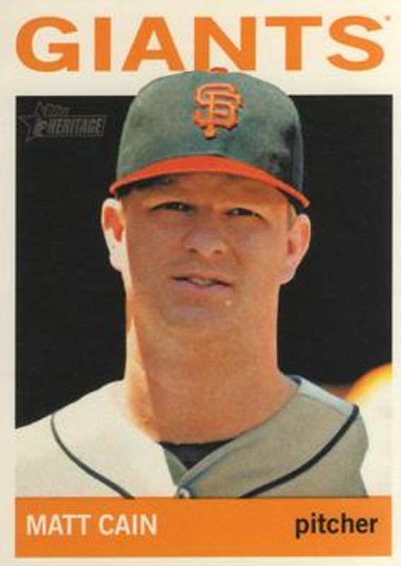 Matt Cain's Baseball cards are available in at least 12 sets. Matt Cain's biggest 7-day price movers are 2013 Topps Heritage #350 Base, 2013 Topps Heritage #64M-MC 1964 Mint - Dime /10, and 2013 Topps Heritage #64M-MC 1964 Mint - JFK Silver Half Dollar /1.