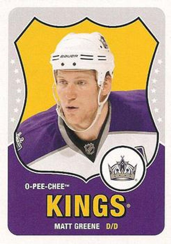 Matt Greene's Hockey cards are available in at least 15 sets. Matt Greene's biggest 7-day price movers are 2010 O-Pee-Chee #454 Retro, 2010 O-Pee-Chee #454 Retro Black Rainbow /100, and 2010 O-Pee-Chee #454 Base.