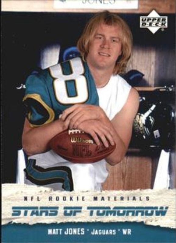 Matt Jones' Football cards are available in at least 5 sets. Matt Jones' biggest 7-day price movers are 2005 Upper Deck Rookie Materials #ST-15 Stars of Tomorrow, 2005 Upper Deck Rookie Materials #116 Base, and 2005 Topps Heritage #GCR-MJ Gridiron Collection Relics.