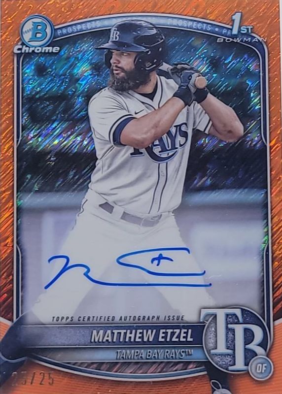 Matthew Etzel's Baseball cards are available in at least 1 sets. Matthew Etzel's biggest 7-day price movers are 2025 Bowman Chrome #CPA-ME Prospect Auto (1st), 2025 Bowman Chrome #CPA-ME Prospect Auto - Orange Shimmer Refractor /25 (1st), and 2025 Bowman Chrome #CPA-ME Prospect Auto - Gold Shimmer Refractor /50 (1st).