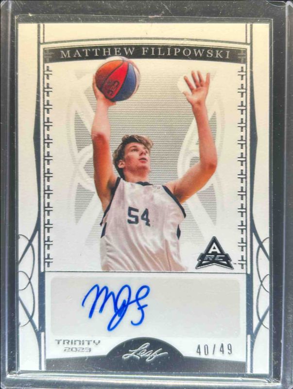 Matthew Filipowski's Basketball cards are available in at least 6 sets. Matthew Filipowski's biggest 7-day price movers are 2022 Leaf Trinity #BA-MF1 Base /49, 2022 Leaf Trinity #CA-MF1 Clear Auto - Holo Gold /10, and 2022 Leaf Trinity #BA-MF1 Holo Green /20.