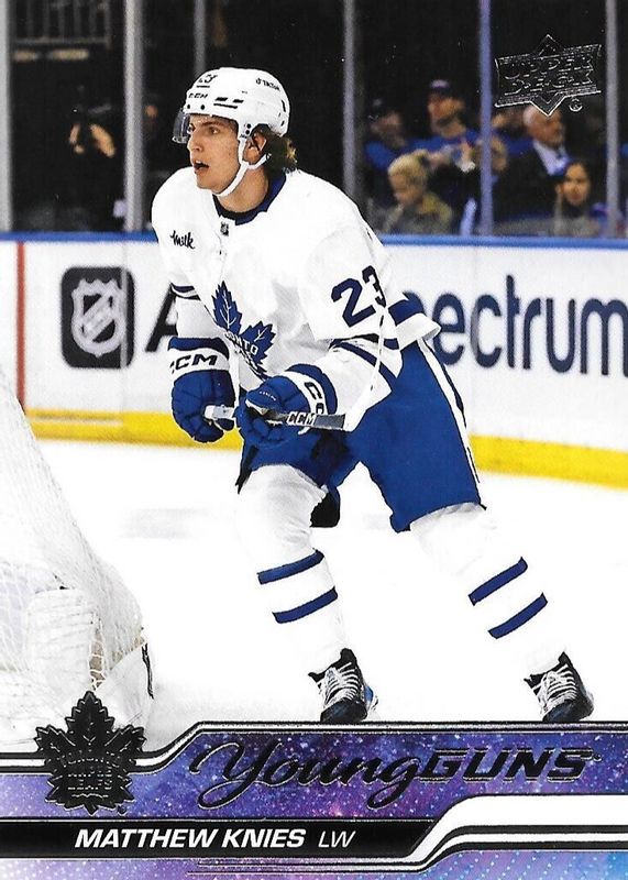 Matthew Knies' Hockey cards are available in at least 33 sets. Matthew Knies' biggest 7-day price movers are 2023 Upper Deck #222 Young Guns Base, 2023 Upper Deck #222 Young Guns - Outburst Silver, and 2023 Upper Deck #C103 Young Guns Canvas.