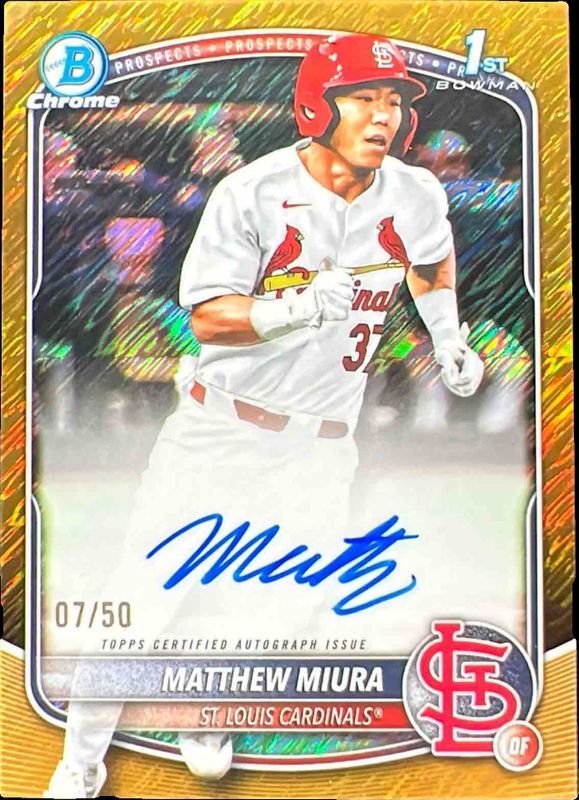 Matthew Miura's Baseball cards are available in at least 1 sets. Matthew Miura's biggest 7-day price movers are 2025 Bowman Draft #CPA-MMI Chrome Prospect Auto - Refractor /499 (1st), 2025 Bowman Draft #CPA-MMI Chrome Prospect Auto - Aqua Lava Refractor /199 (1st), and 2025 Bowman Draft #CPA-MMI Chrome Prospect Auto - Gold Wave Refractor /50 (1st).