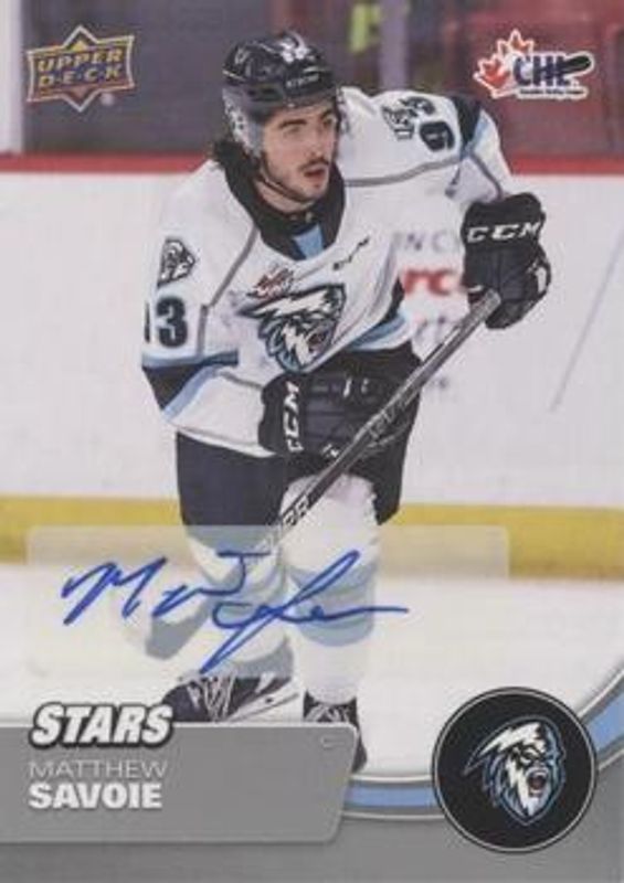 Matthew Savoie's Hockey cards are available in at least 4 sets. Matthew Savoie's biggest 7-day price movers are 2021 Upper Deck CHL #341 Autographs, 2021 Upper Deck CHL #341 Clear Cut, and 2021 Upper Deck CHL #A8 Destination: The Show Bronze Achievements /198.