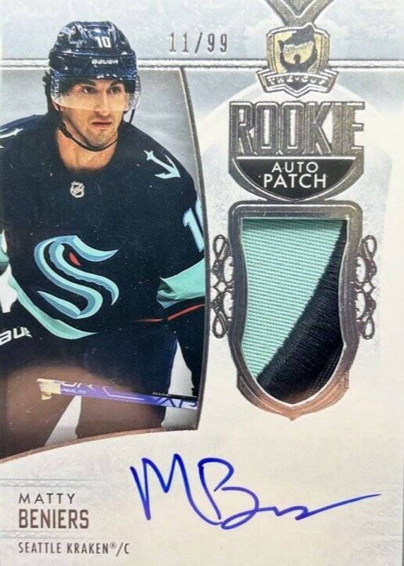 Matty Beniers' Hockey cards are available in at least 53 sets. Matty Beniers' biggest 7-day price movers are 2022 Upper Deck #213 Young Guns Base, 2022 Upper Deck The Cup #146 Rookie Patch Auto (/99), and 2022 Upper Deck #213 Young Guns - Clear Cut.