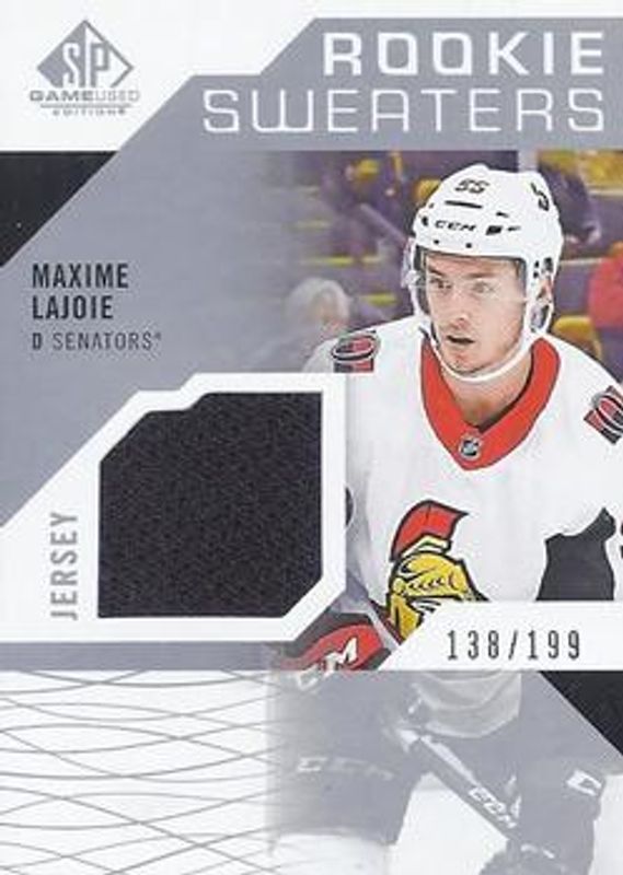 Max Lajoie's Hockey cards are available in at least 3 sets. Max Lajoie's biggest 7-day price movers are 2018 SP Game Used #RS-ML Rookie Sweaters /199, 2018 SP Game Used #RRB-ML 2018 Rookie Relic Blends Patch /15, and 2018 SP Game Used #113 Gold Spectrum Premium Material /49.