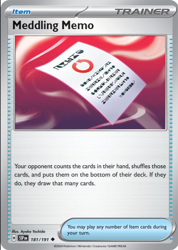 Meddling Memo's Pokemon cards are available in at least 1 sets. Meddling Memo's biggest 7-day price movers are 2024 Scarlet & Violet: Surging Sparks #181/191 Base, and 2024 Scarlet & Violet: Surging Sparks #181/191 Reverse Holo.