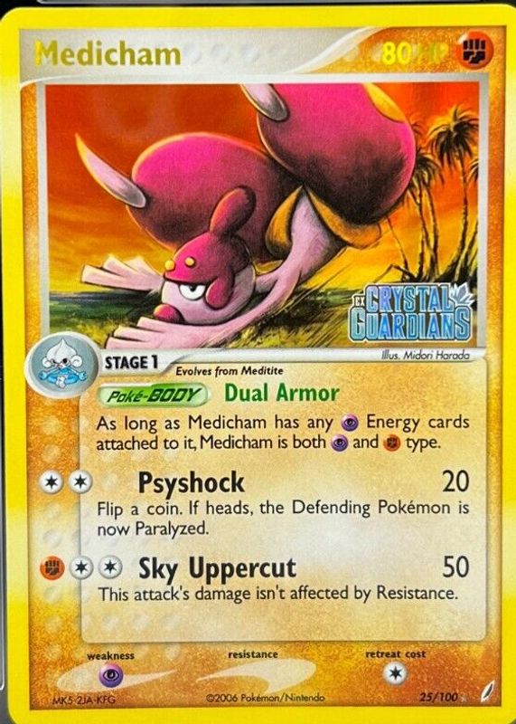 Medicham's Pokemon cards are available in at least 16 sets. Medicham's biggest 7-day price movers are 2006 EX: Crystal Guardians #025/100 Reverse Holo, 2006 EX: Crystal Guardians #025/100 Base, and 2009 Japanese Platinum: Beat of the Frontier #043/100 1st Edition.