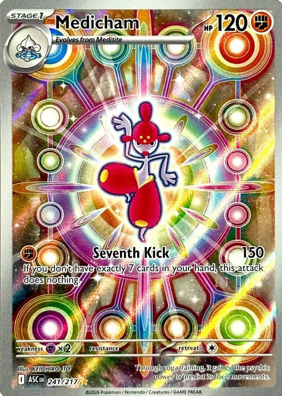 Medicham's Pokemon cards are available in at least 17 sets. Medicham's biggest 7-day price movers are 2026 Mega Evolution: Ascended Heroes #241/217 Illustration Rare, 2025 Japanese Mega: Mega Dream ex #207/193 Art Rare, and 2007 EX: Power Keepers #034/108 Reverse Holo.
