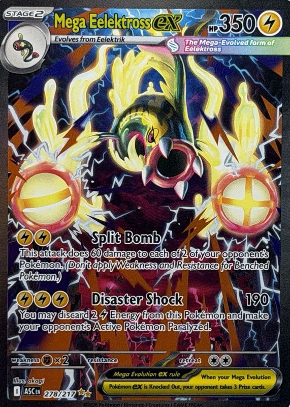 Mega Eelektross ex's Pokemon cards are available in at least 2 sets. Mega Eelektross ex's biggest 7-day price movers are 2025 Japanese Mega: Mega Dream ex #235/193 Special Art Rare, 2025 Japanese Mega: Mega Dream ex #225/193 Mega Attack Rare, and 2026 Mega Evolution: Ascended Heroes #278/217 Special Illustration Rare.