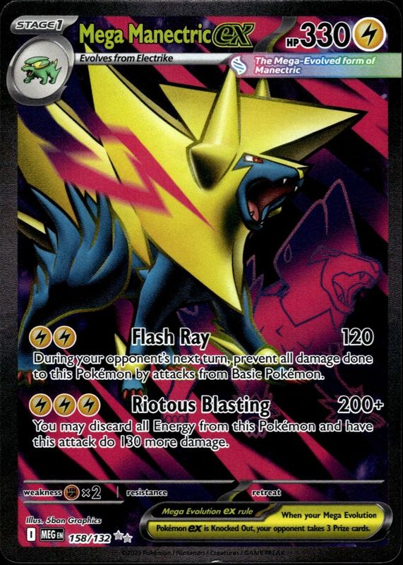 Mega Manectric ex's Pokemon cards are available in at least 5 sets. Mega Manectric ex's biggest 7-day price movers are 2025 Japanese Mega Symphonia #77/63 Super Rare (Full Art), 2025 Mega Evolution #158/132 Ultra Rare (Full Art), and 2014 XY: Phantom Forces #120/119 Holo (Secret).