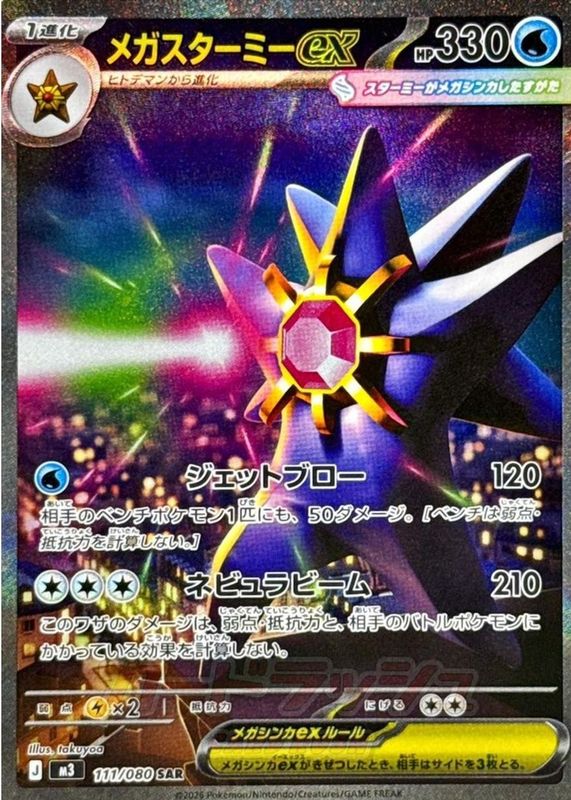 Mega Starmie ex's Pokemon cards are available in at least 1 sets. Mega Starmie ex's biggest 7-day price movers are 2026 Japanese Mega: Nihil Zero #95/80 Super Rare (Full Art), 2026 Japanese Mega: Nihil Zero #21/80 Double Rare, and 2026 Japanese Mega: Nihil Zero #111/80 Special Art Rare.