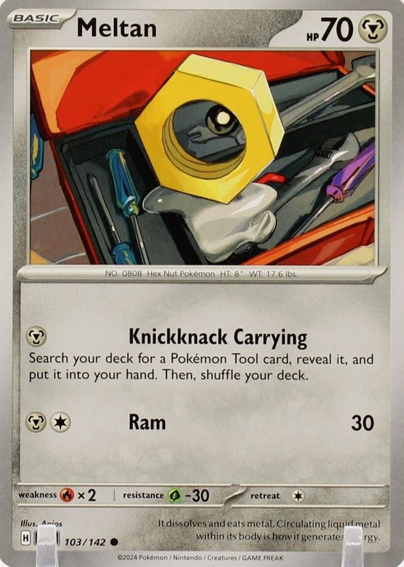 Meltan's Pokemon cards are available in at least 5 sets. Meltan's biggest 7-day price movers are 2024 Scarlet & Violet: Temporal Forces #179/162 Illustration Rare, 2024 Scarlet & Violet: Stellar Crown #103/142 Base, and 2024 Japanese Scarlet & Violet: Stellar Miracle #070/102 Base.