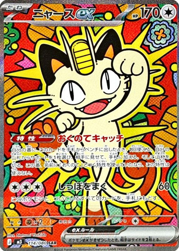 Meowth ex's Pokemon cards are available in at least 1 sets. Meowth ex's biggest 7-day price movers are 2026 Japanese Mega: Nihil Zero #114/80 Special Art Rare, 2026 Japanese Mega: Nihil Zero #100/80 Super Rare (Full Art), and 2026 Japanese Mega: Nihil Zero #61/80 Double Rare.