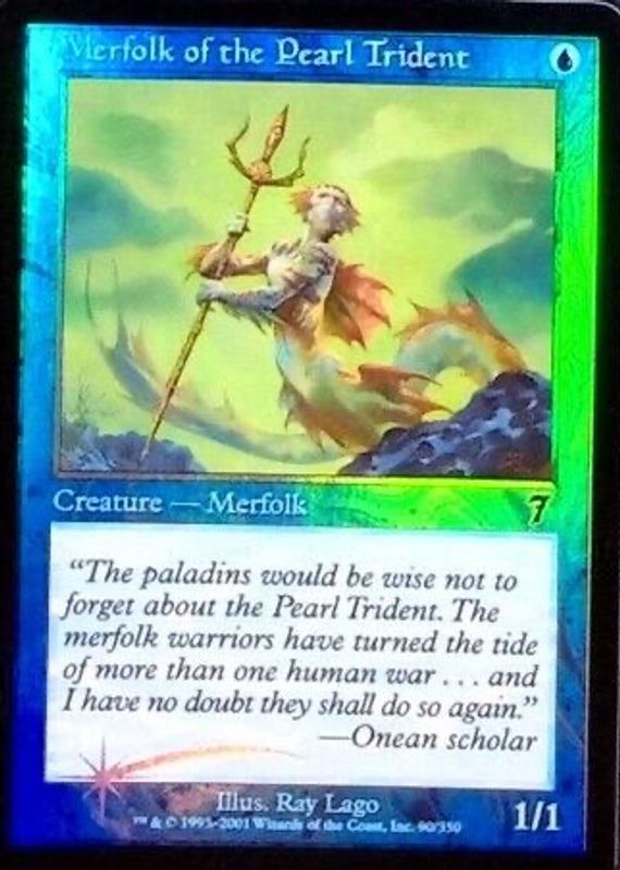 Merfolk of the Pearl Trident's Magic: The Gathering cards are available in at least 5 sets. Merfolk of the Pearl Trident's biggest 7-day price movers are 2001 Seventh Edition #90 Foil, 1993 Unlimited Edition Base, and 1993 Beta Edition Base.