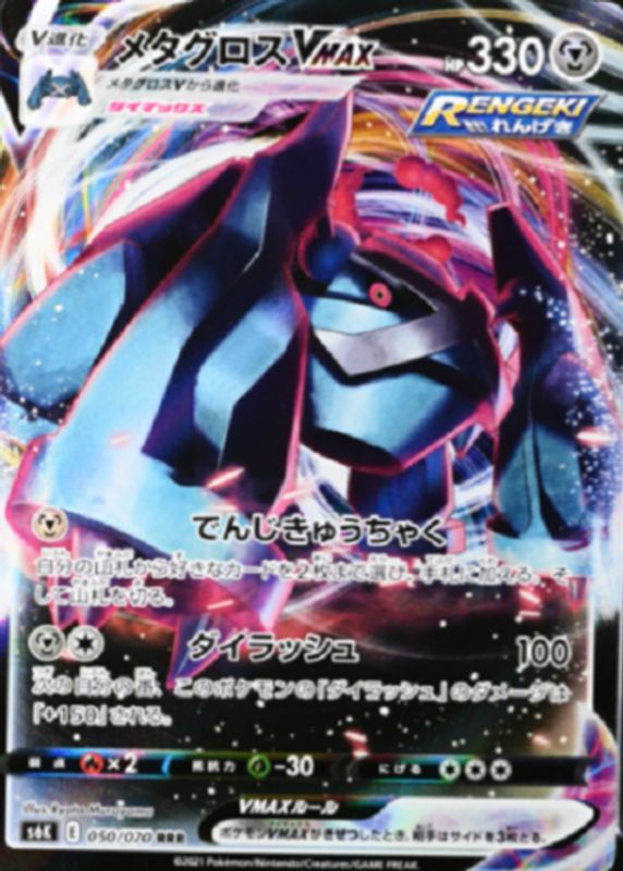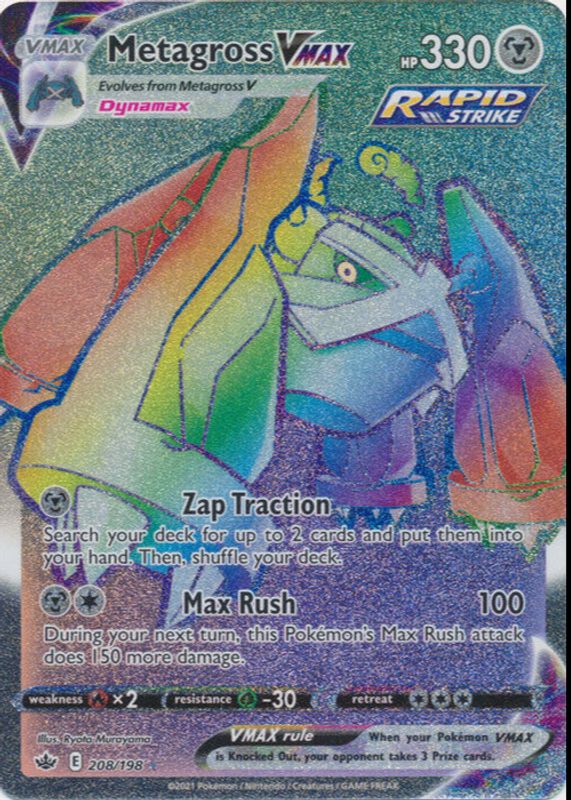 Metagross VMAX's Pokemon cards are available in at least 2 sets. Metagross VMAX's biggest 7-day price movers are 2021 Sword & Shield: Chilling Reign #113/198 Holo, 2021 Sword & Shield: Chilling Reign #208/198 Holo (Secret), and 2021 Japanese Sword & Shield: Jet-Black Spirit #050/070 Triple Rare.