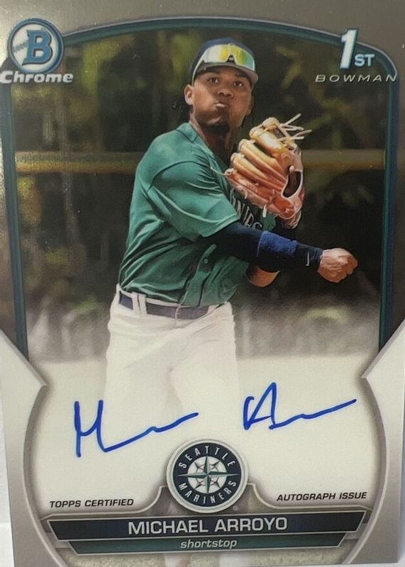 Michael Arroyo's Baseball cards are available in at least 8 sets. Michael Arroyo's biggest 7-day price movers are 2023 Bowman #BCP-63 Chrome Prospects - Lunar Glow Refractor (1st), 2023 Bowman #CPA-MA Chrome Prospect Auto (1st), and 2023 Bowman Mega Box #BMA-MA Chrome Prospect Auto.