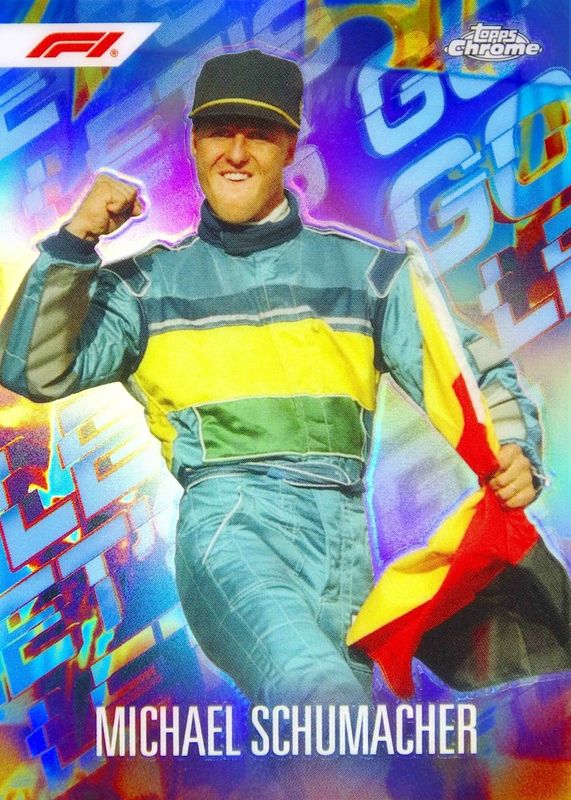 Michael Schumacher's Racing cards are available in at least 8 sets. Michael Schumacher's biggest 7-day price movers are 2024 Topps Finest Formula 1 #LG-21 Let's Go /(SSP), 2023 Topps Chrome Formula 1 #199 Red & Green Refractor, and 2023 Topps Chrome Formula 1 #199 Gold Checker Flag Refractor /50.
