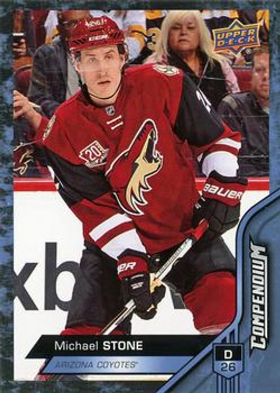 Michael Stone's Hockey cards are available in at least 27 sets. Michael Stone's biggest 7-day price movers are 2016 Upper Deck Compendium #316 Blue, 2016 Upper Deck Compendium #316 Printing Plates Yellow /1, and 2016 Upper Deck Compendium #316 Printing Plates Black /1.