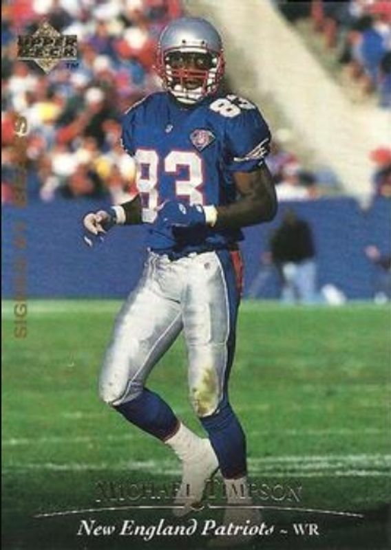 Michael Timpson's Football cards are available in at least 11 sets. Michael Timpson's biggest 7-day price movers are 1995 Upper Deck #104 Base, 1995 Upper Deck Collector's Choice #110 Base, and 1995 Upper Deck Collector's Choice Update #U183 Base.