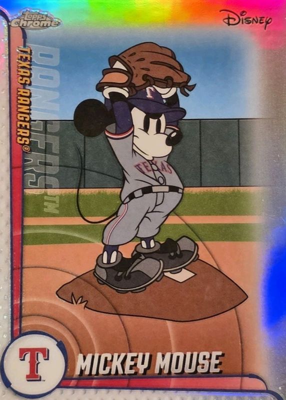 Mickey Mouse (Rangers)'s Baseball cards are available in at least 2 sets. Mickey Mouse (Rangers)'s biggest 7-day price movers are 2025 Topps Chrome Update #MLBA-10 Mickey & Friends - Black Refractor /10, 2025 Topps Chrome Update #MLBA-10 Mickey & Friends - Red Refractor /5, and 2025 Topps Chrome Update #MLBA-10 Mickey & Friends - Superfractor /1.