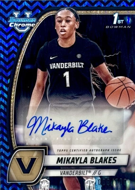 Mikayla Blakes' Basketball cards are available in at least 5 sets. Mikayla Blakes' biggest 7-day price movers are 2024 Bowman Chrome University #55 Prospect Auto - Black & Blue Stealth Refractor /100 (1st), 2024 Bowman Chrome University #55 Prospect Auto - Refractor (1st), and 2024 Bowman U Now #79 Purple /25.