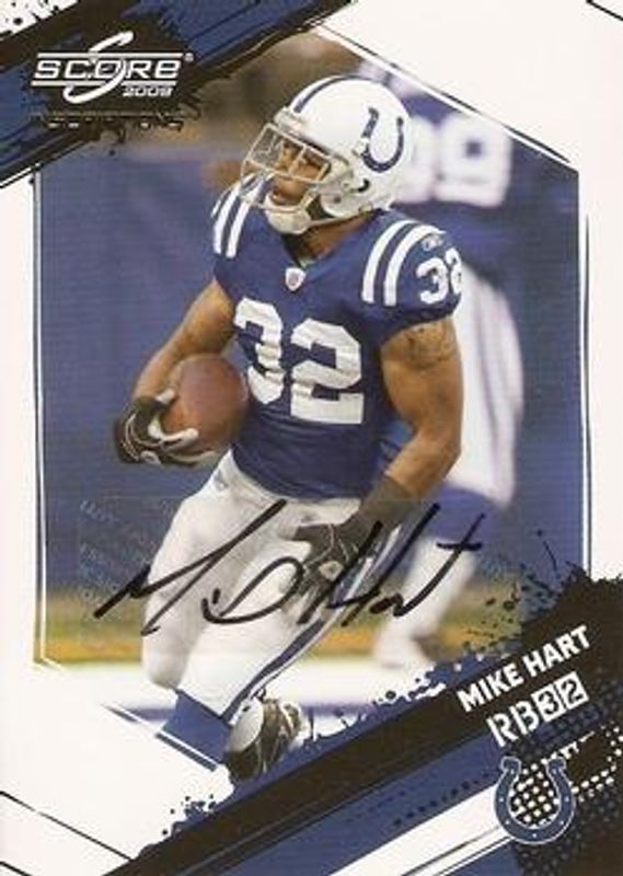 Mike Hart's Football cards are available in at least 14 sets. Mike Hart's biggest 7-day price movers are 2009 Score Inscriptions #129 Autographs /99, 2009 Score Inscriptions #129 Autographs - Gold Zone /50, and 2009 Score Inscriptions #129 Base /999.