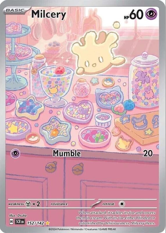 Milcery's Pokemon cards are available in at least 6 sets. Milcery's biggest 7-day price movers are 2024 Scarlet & Violet: Stellar Crown #152/142 Illustration Rare, 2024 Japanese Scarlet & Violet: Stellar Miracle #110/102 Art Rare, and 2024 Scarlet & Violet: Stellar Crown #064/142 Base.