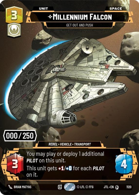Millennium Falcon - Get Out And Push's Star Wars Unlimited cards are available in at least 1 sets. Millennium Falcon - Get Out And Push's biggest 7-day price movers are 2025 Jump to Lightspeed #1120 Prestige Serialized /250, 2025 Jump to Lightspeed #1048 Prestige, and 2025 Jump to Lightspeed #1076 Prestige Foil.