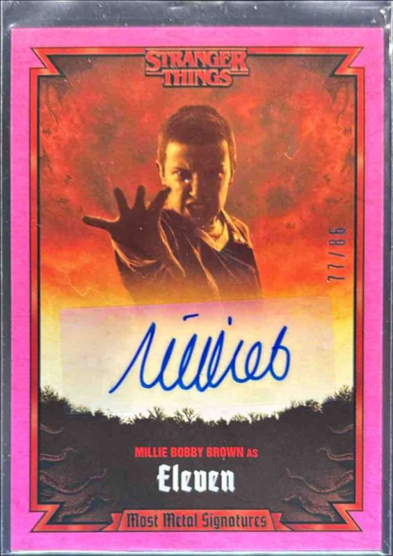 Millie Bobby Brown's Pop Culture cards are available in at least 2 sets. Millie Bobby Brown's biggest 7-day price movers are 2023 Zerocool Stranger Things Season 4 #MMA-MBB Most Metal Signatures - 1986 Pink /86, 2023 Zerocool Stranger Things Season 4 #RSA-MBB Running Up That Hill Autographs - Zerocool Black, and 2023 Zerocool Stranger Things Season 4 #RSA-MBB Running Up That Hill Autographs - Vecna Red /1.