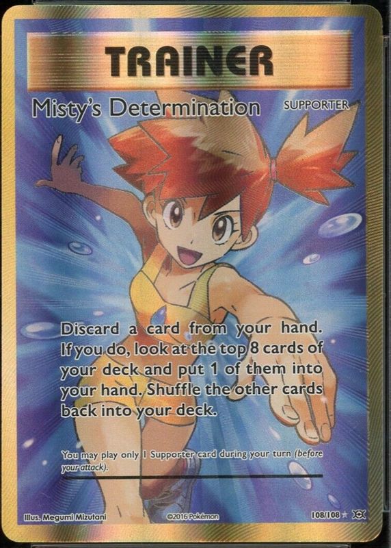 Misty's Determination's Pokemon cards are available in at least 4 sets. Misty's Determination's biggest 7-day price movers are 2019 Sun & Moon: Hidden Fates #62/68 Base, 2016 XY: Evolutions #108/108 Holo (Full Art), and 2016 Japanese XY: 20th Anniversary #085/087 1st Edition.