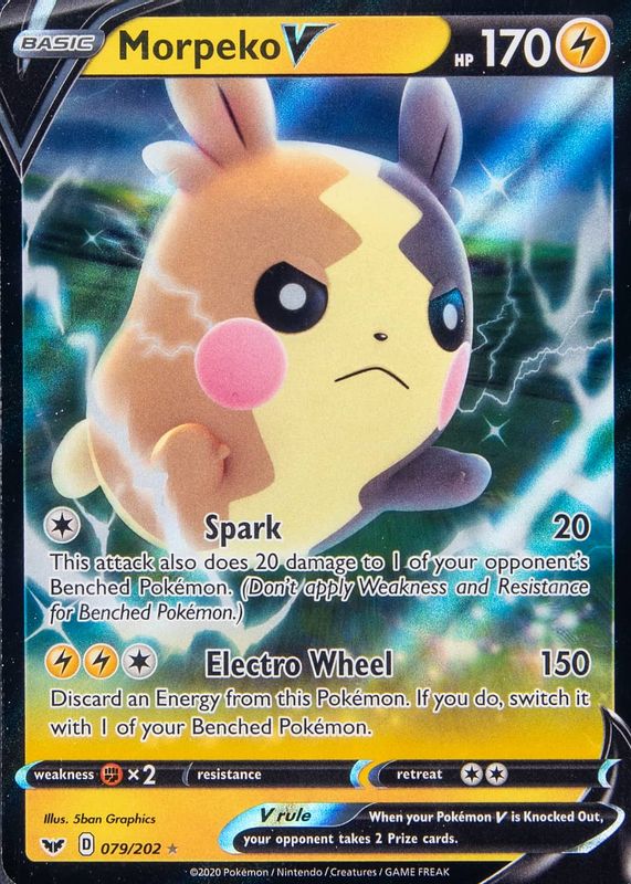 Morpeko V's Pokemon cards are available in at least 3 sets. Morpeko V's biggest 7-day price movers are 2021 Sword & Shield: Shining Fates #037/072 Holo, 2020 Sword & Shield #079/202 Holo, and 2020 Sword & Shield #190/202 Holo (Full Art).
