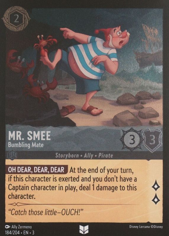 Mr Smee - Bumbling Mate's Disney Lorcana cards are available in at least 1 sets. Mr Smee - Bumbling Mate's biggest 7-day price movers are 2024 Into the Inklands #184/204 Cold Foil, and 2024 Into the Inklands #184/204 Base.