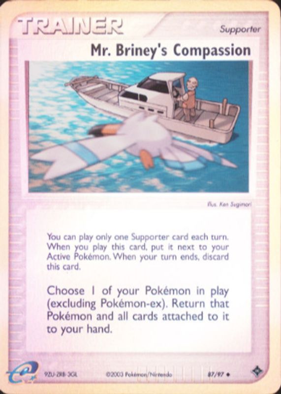 Mr. Briney's Compassion's Pokemon cards are available in at least 3 sets. Mr. Briney's Compassion's biggest 7-day price movers are 2003 EX: Dragon #87/97 Reverse Holo, 2003 EX: Dragon #87/97 Base, and 2003 Japanese EX: Rulers of the Heavens #052/054 1st Edition.