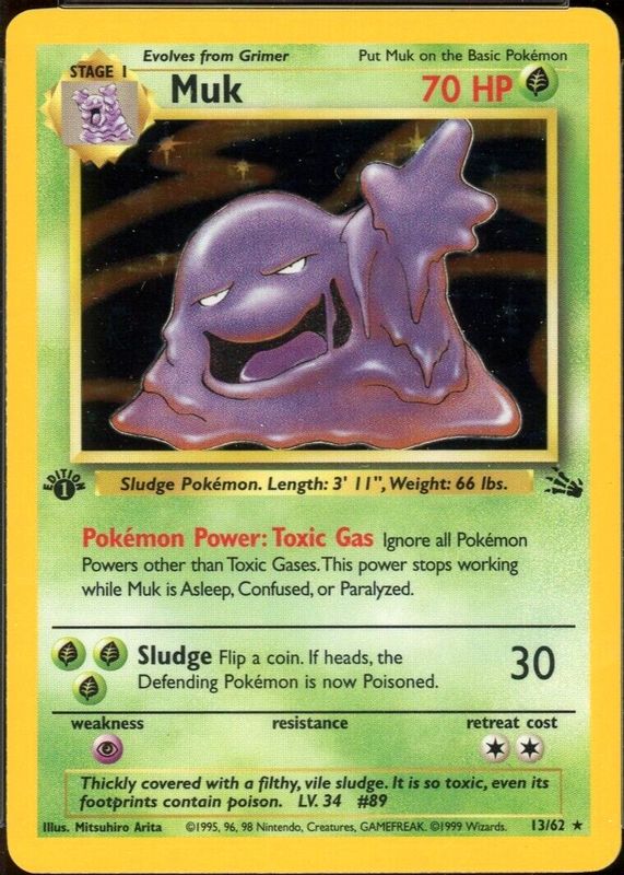 Muk's Pokemon cards are available in at least 24 sets. Muk's biggest 7-day price movers are 1999 Fossil #13/62 Unlimited Holo, 1999 Fossil #13/62 1st Edition Holo, and 2003 Aquapolis #H17 Holo.