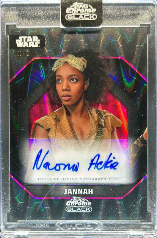 Naomi Ackie's Star Wars cards are available in at least 5 sets. Naomi Ackie's biggest 7-day price movers are 2024 Topps Chrome Black Star Wars #ALS-NA Light Side Autographs - Magenta Ray Wave Refractor /10, 2024 Topps Chrome Black Star Wars #ALS-NA Light Side Autographs - Yellow Printing Plate /1, and 2024 Topps Chrome Black Star Wars #ALS-NA Light Side Autographs.
