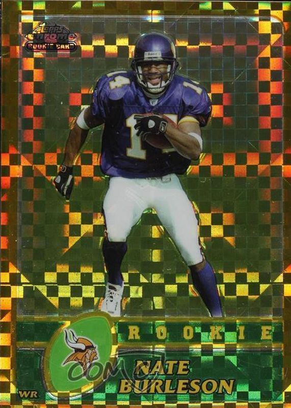Nate Burleson's Football cards are available in at least 8 sets. Nate Burleson's biggest 7-day price movers are 2003 Topps Chrome #218 Gold X-Fractor /101, 2003 Bowman Chrome #155 Base, and 2003 SPx #194 Base /1100.