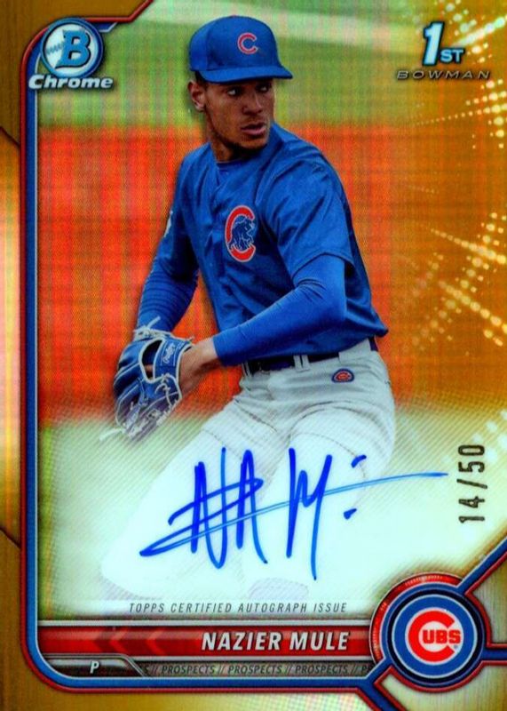 Nazier Mule's Baseball cards are available in at least 3 sets. Nazier Mule's biggest 7-day price movers are 2022 Bowman Draft #CDA-NME Chrome DP Auto - Gold Refractor /50 (1st), 2022 Bowman Draft #CDA-NME Chrome DP Auto - Sparkle Refractor /71 (1st), and 2022 Bowman Draft #CDA-NME Chrome DP Auto - Red Lava Refractor /5 (1st).