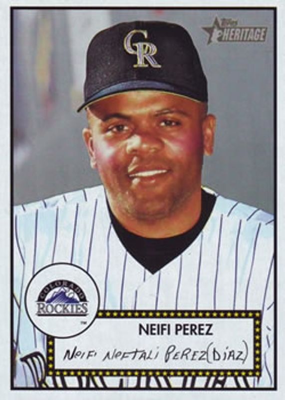 Neifi Perez's Baseball cards are available in at least 29 sets. Neifi Perez's biggest 7-day price movers are 2001 Topps Heritage #155 Base, 2002 Topps Heritage #49 Base, and 2004 Topps Heritage #285 Base.