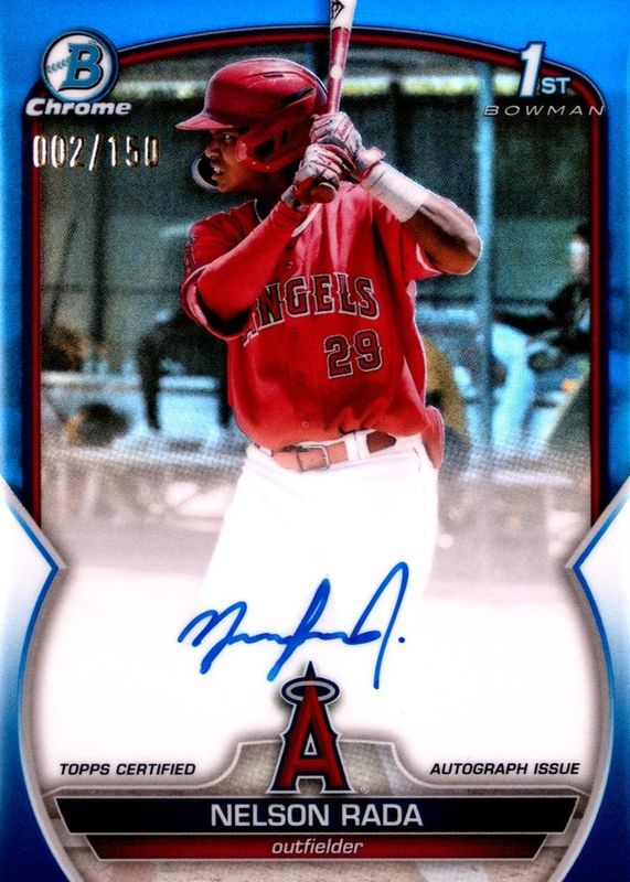 Nelson Rada's Baseball cards are available in at least 5 sets. Nelson Rada's biggest 7-day price movers are 2023 Bowman #BCP-132 Chrome Prospects (1st), 2023 Bowman Mega Box #BCP-132 Chrome Prospects (1st), and 2023 Bowman #CPA-NR Chrome Prospect Auto - Blue Refractor /150 (1st).