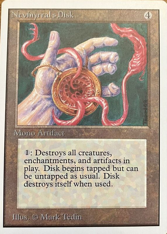 Nevinyrral's Disk's Magic: The Gathering cards are available in at least 4 sets. Nevinyrral's Disk's biggest 7-day price movers are 1993 Unlimited Edition Base, 1993 Alpha Edition Base, and 1995 Fourth Edition Base.