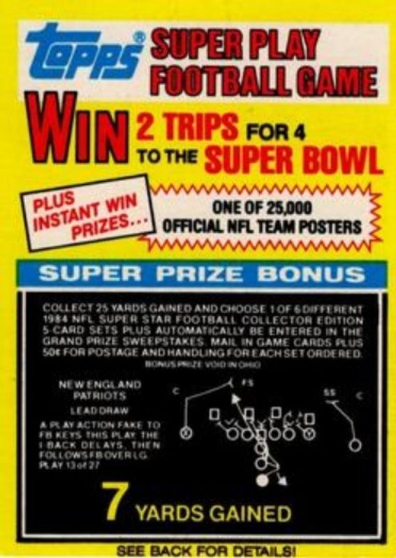 New England Patriots' Football cards are available in at least 2 sets. New England Patriots' biggest 7-day price movers are 1984 Topps #13 Super Play Game Cards, and 1988 Fleer Team Action #NNO Stickers.
