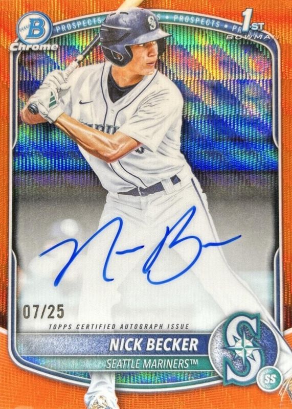 Nick Becker's Baseball cards are available in at least 2 sets. Nick Becker's biggest 7-day price movers are 2025 Bowman Draft #CPA-NB Chrome Prospect Auto (1st), 2025 Bowman Draft #CPA-NB Chrome Prospect Auto - Orange Wave Refractor /25 (1st), and 2025 Bowman Draft #CPA-NB Chrome Prospect Auto - Purple Refractor /250 (1st).