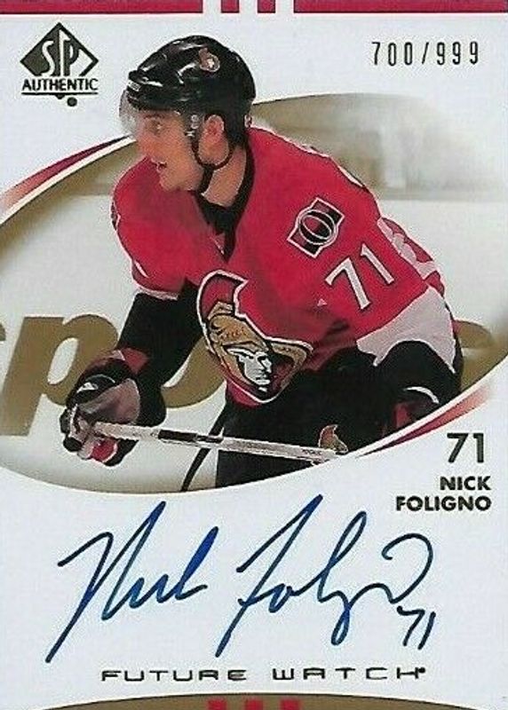 Nick Foligno's Hockey cards are available in at least 96 sets. Nick Foligno's biggest 7-day price movers are 2007 SP Authentic #235 Future Watch Auto /999, 2021 Fleer Ultra #SM-27 Slot Machines, and 2025 Upper Deck MVP #38 Base.